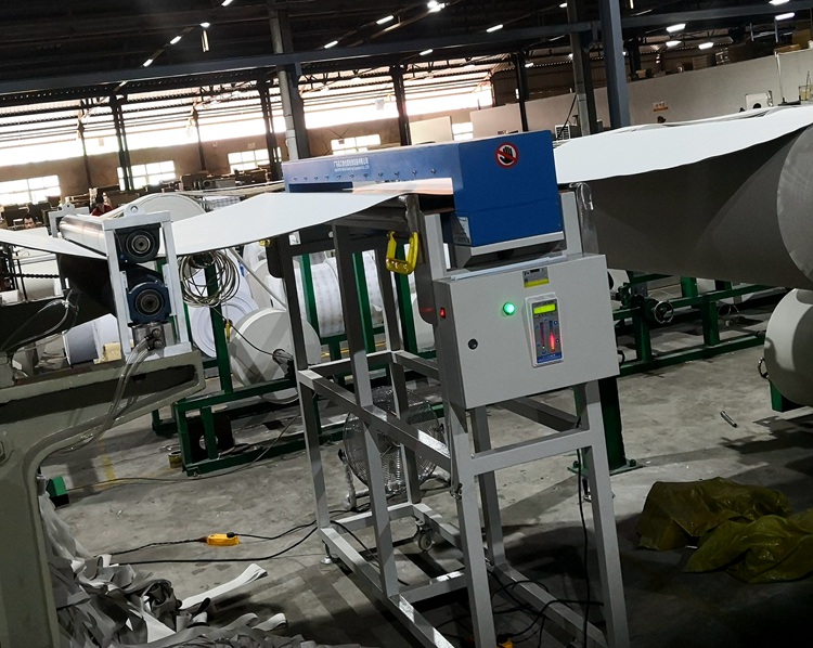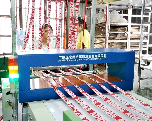 新某利紡織廠專業(yè)生產(chǎn)滴膠絲印織帶,因客戶品質(zhì)要求加裝連之新金屬檢測機探頭于現(xiàn)有生產(chǎn)線,可一次性檢測多條織帶,如有需要可控制停機。