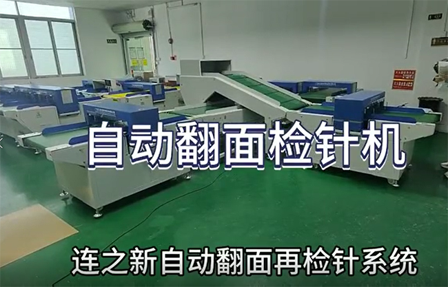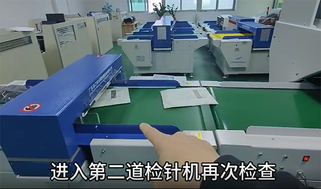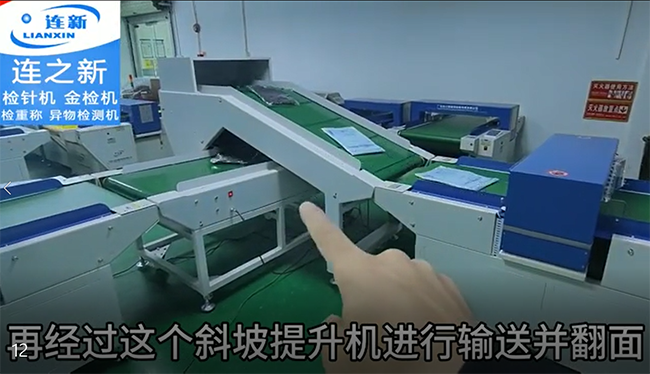 把衣服放進檢針機,經(jīng)過第一臺檢針機的檢測沒有問題后,再經(jīng)過斜坡提升機進行輸送關(guān)翻面,翻面后,經(jīng)過輸送機輸出,進入第二道檢針機再次檢查。