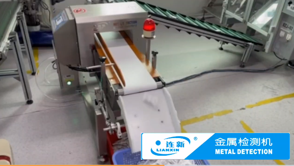干燥劑金檢機加裝斜坡提升機可對接包裝機,檢測到金屬后翻板剔除